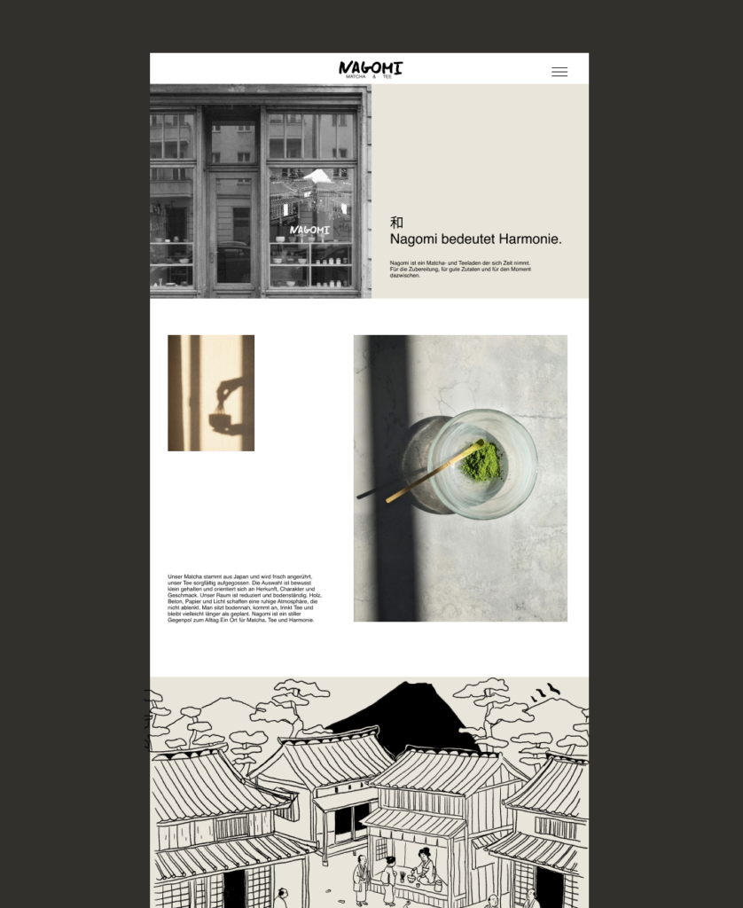 Statt kurzfristigen Looks greift das Konzept klassische japanische Elemente auf und wirkt dadurch eigenständig und langfristig gedacht.  Die Gestaltung überträgt die Haltung des Ortes nach außen. Das zeigt sich im Raum, im Printdesign und im Online Auftritt.